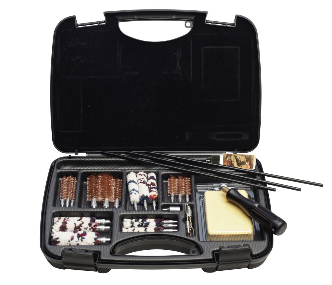 Набор универсальный для всех видов оружия. В набор входит: разборный шомпол, наборы ершиков для 12-16к, кал. 38-40-45, кал. 5,6-7-8мм, вишеры, тканевые патчи, нейтральное масло, графитовая смазка.